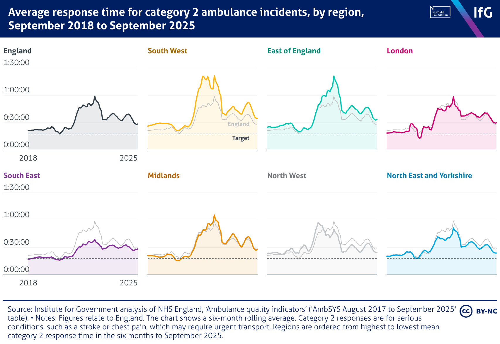 A small multiples chart from the Institute for Government showing Average response time for category 2 ambulance incidents, by region, September 2018 to September 2025. Response times rose sharply across all regions during the pandemic and have remained well above the national target across all regions. The South West and East of England have recorded the longest waits, while the South East performed relatively better over the time period.