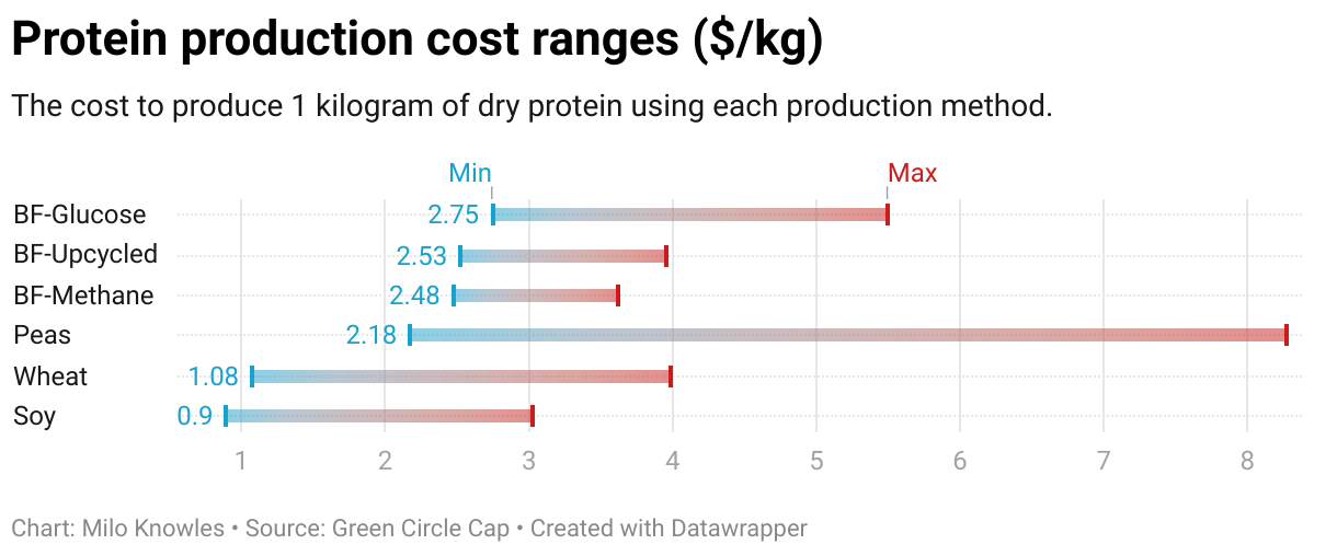 The cost to produce 1 kilogram of dry protein using each production method.