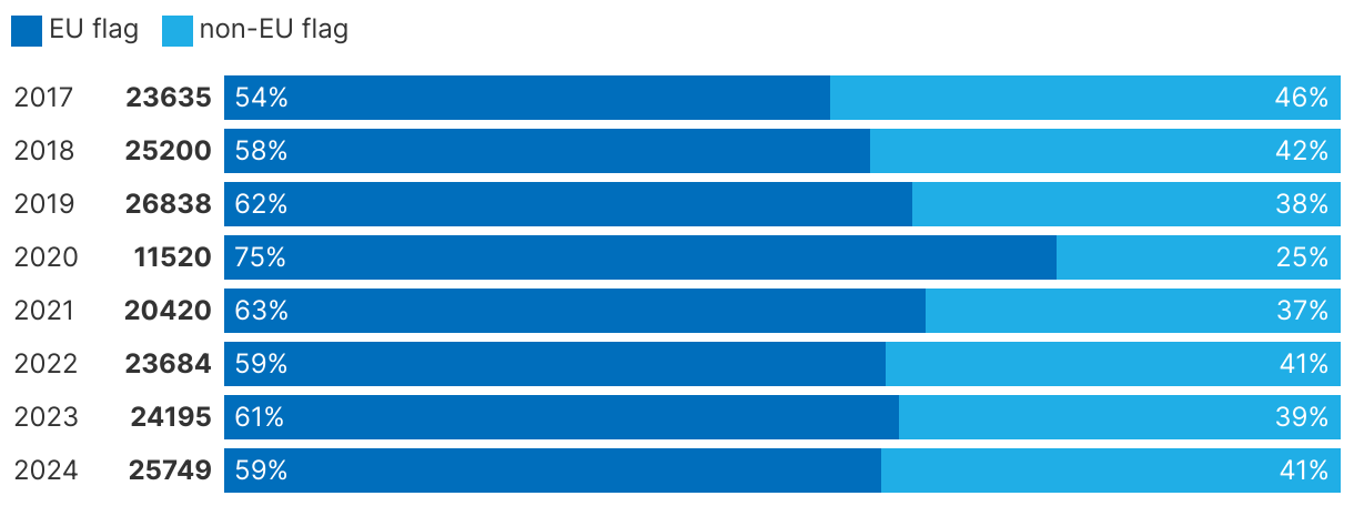 Total number of port calls and percentage according to ships' flags