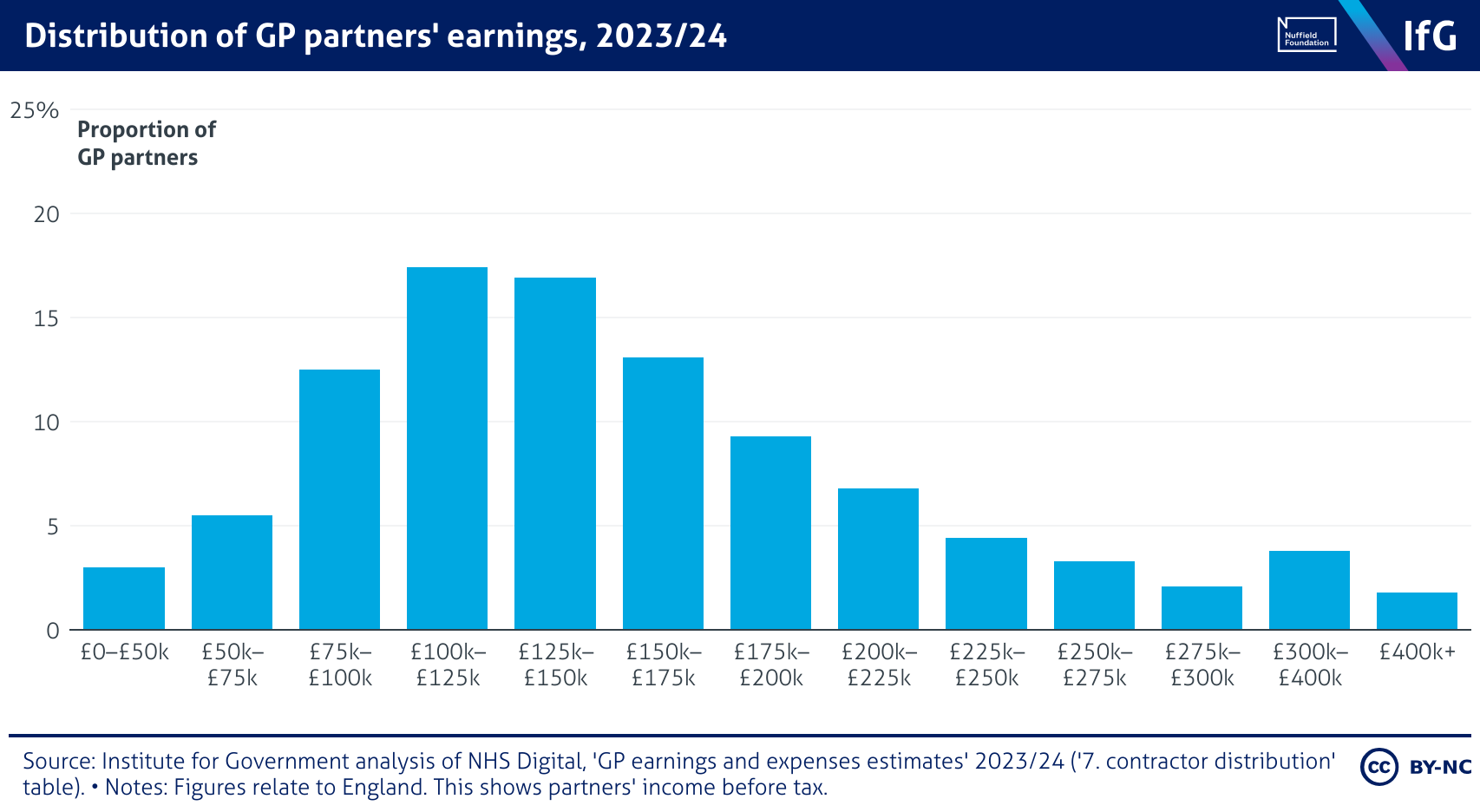 A bar chart from the Institute for Government showing Distribution of GP partners’ earnings, 2023/24, where most partners earned between £100,000 and £150,000, making up around 34% of all partners. Fewer than 12% earned above £250,000, while only 3% earned below £50,000.
