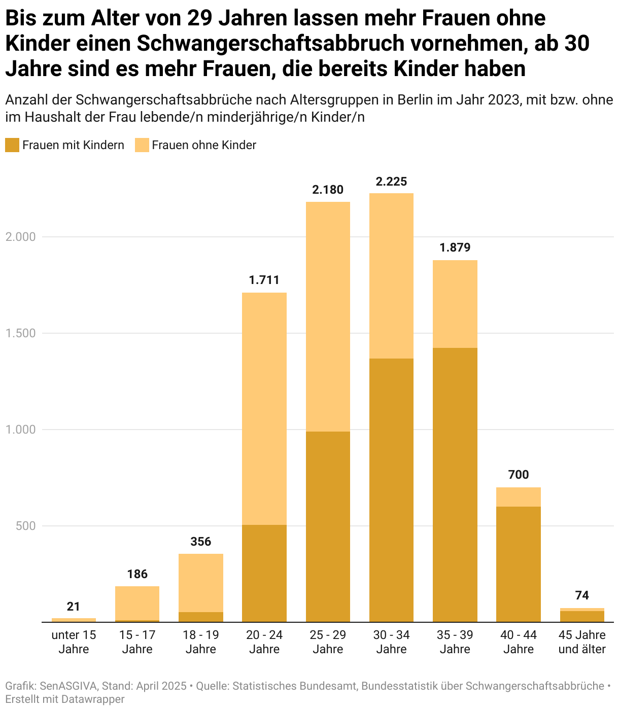 Bis zum Alter von 29 Jahren lassen mehr Frauen ohne Kinder einen Schwangerschaftsabbruch vornehmen, ab 30 Jahre sind es mehr Frauen, die bereits Kinder haben