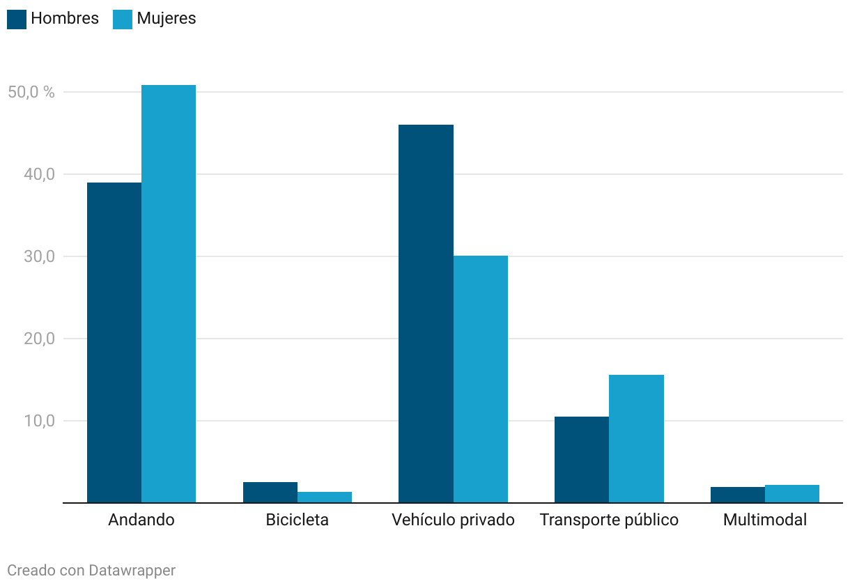 Distribución de los desplazamientos diarios (%) por género y medio de transporte