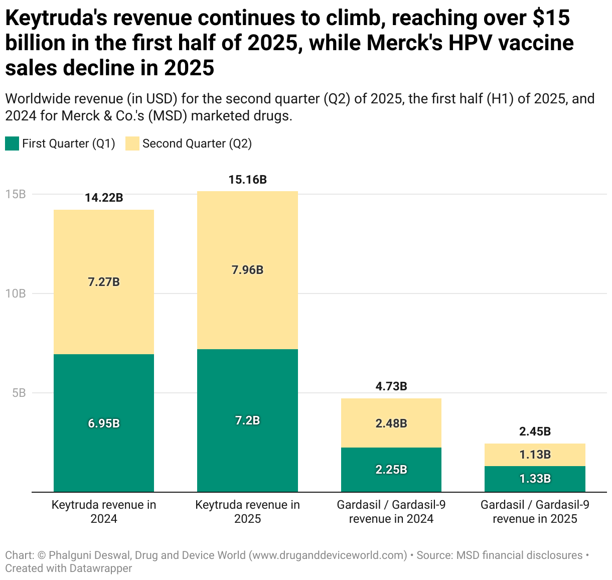 Worldwide revenue (in USD) for the second quarter (Q2) of 2025, the first half (H1) of 2025, and 2024 for Merck & Co.'s (MSD) marketed drugs.