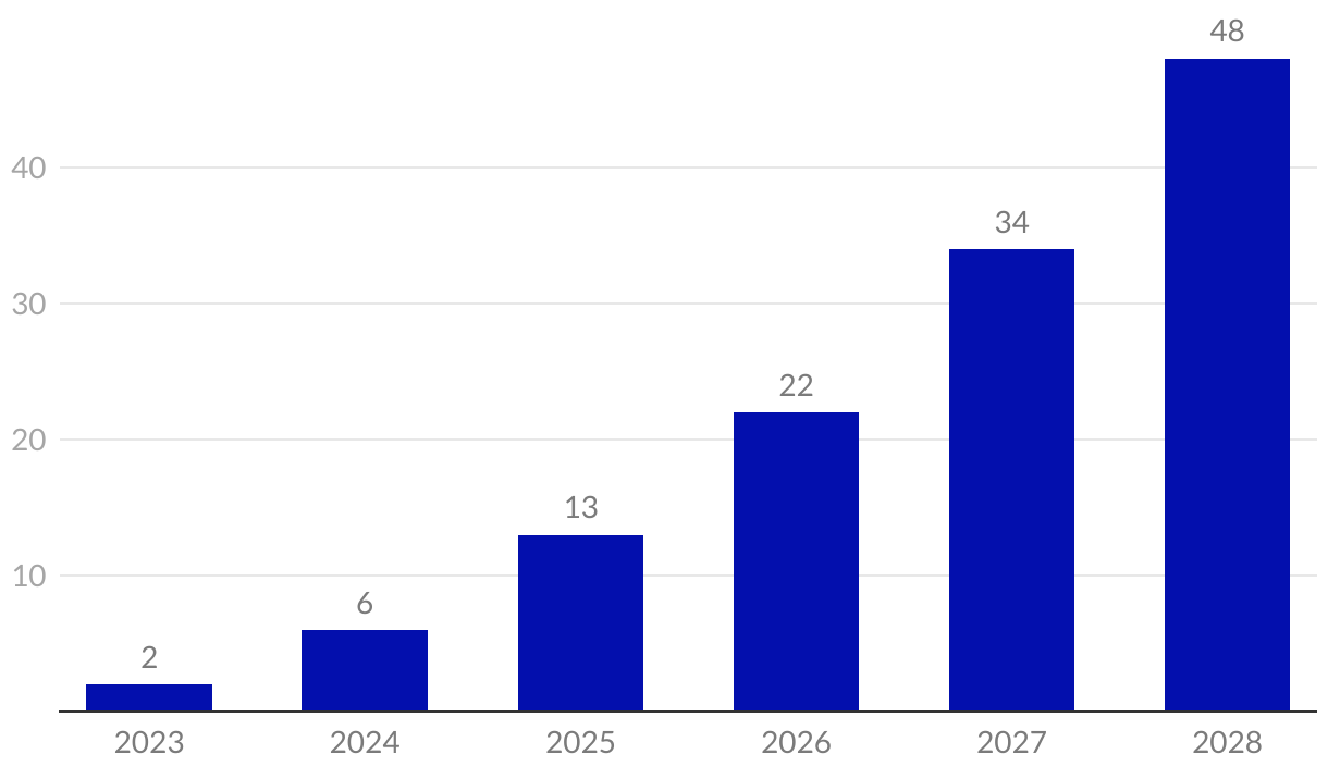 Wielkość rynku treści audiowizualnych tworzonych przez generatywną sztuczną inteligencję (Gen AI) w 2023 r. i prognoza na lata 2024-2028, w mld euro