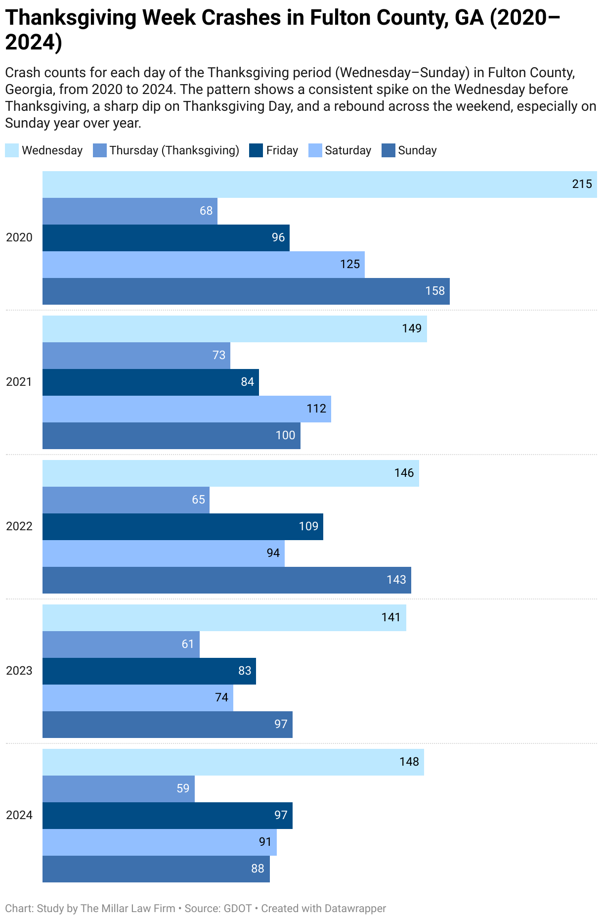 Crash counts for each day of the Thanksgiving period (Wednesday–Sunday) in Fulton County, Georgia, from 2020 to 2024. The pattern shows a consistent spike on the Wednesday before Thanksgiving, a sharp dip on Thanksgiving Day, and a rebound across the weekend, especially on Sunday year over year.