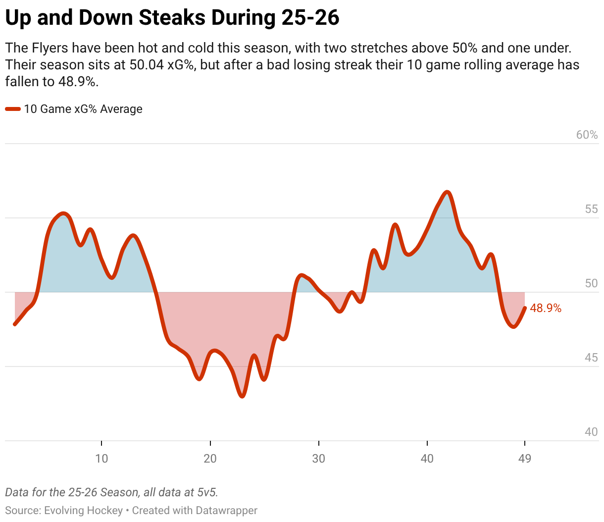 The Flyers have been hot and cold this season, with two stretches above 50% and one under. Their season sits at 50.04 xG%, but after a bad losing streak their 10 game rolling average has fallen to 48.9%.