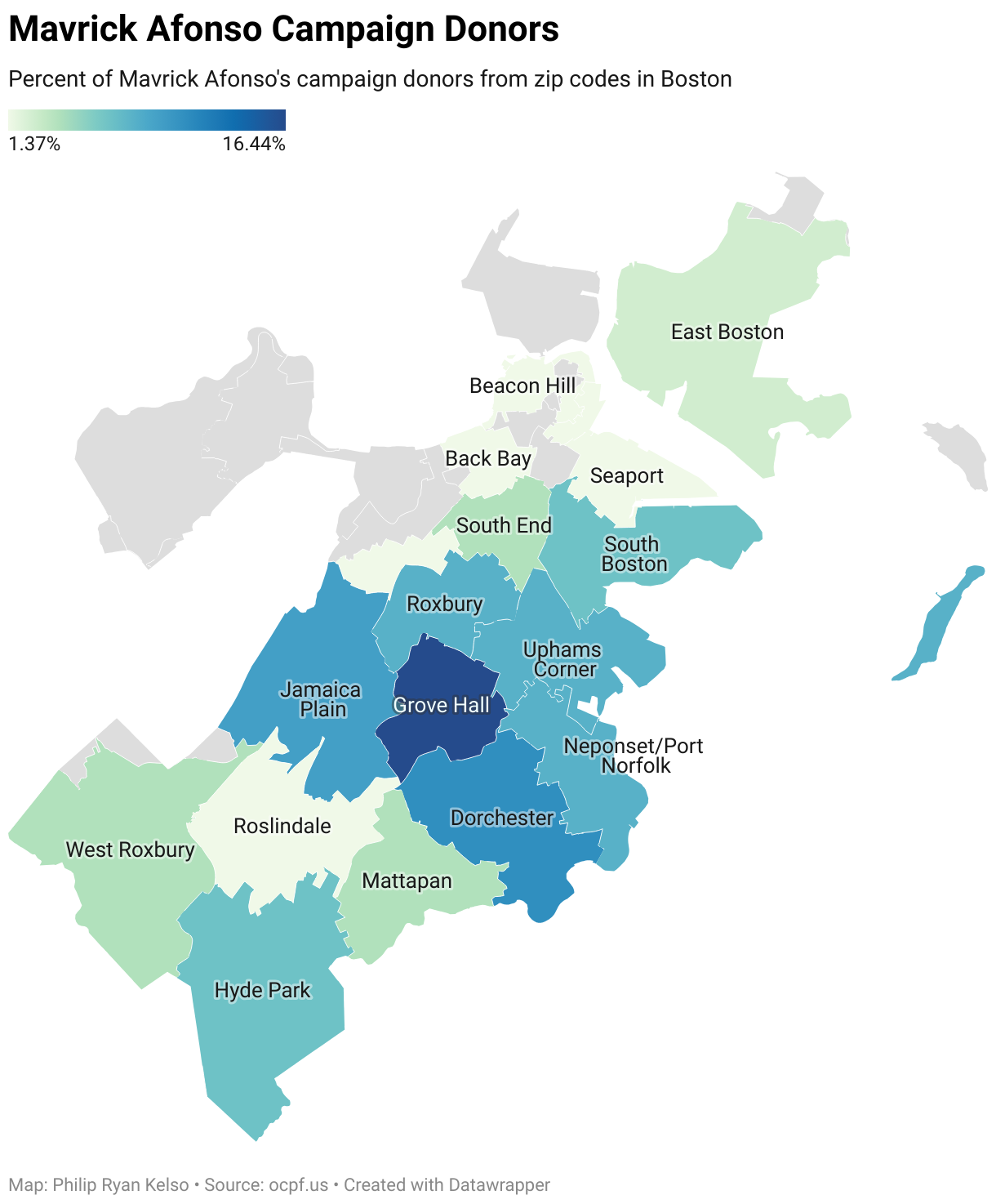 Percent of Mavrick Afonso's campaign donors from zip codes in Boston