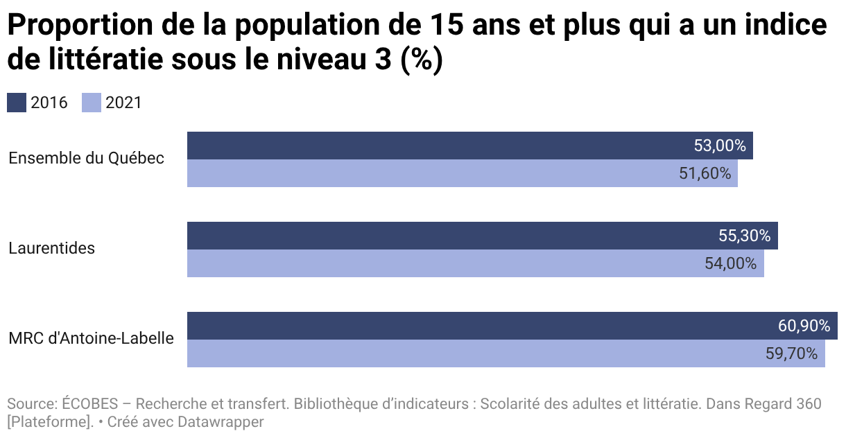 Proportion de la population de 15 ans et plus qui a un indice de littératie sous le niveau 3 (%)