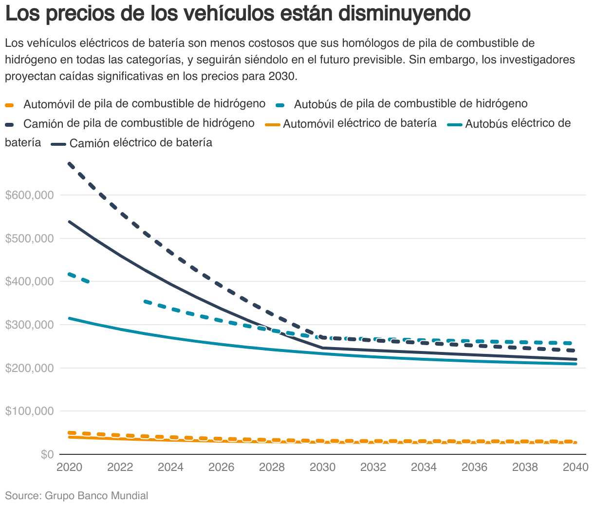 Los vehículos eléctricos de batería son menos costosos que sus homólogos de pila de combustible de hidrógeno en todas las categorías, y seguirán siéndolo en el futuro previsible. Sin embargo, los investigadores proyectan caídas significativas en los precios para 2030.