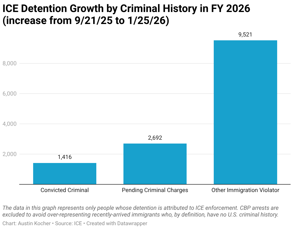ICE Detention Growth by Criminal History in FY 2026 (increase from 9/21/25 to 1/25/26)