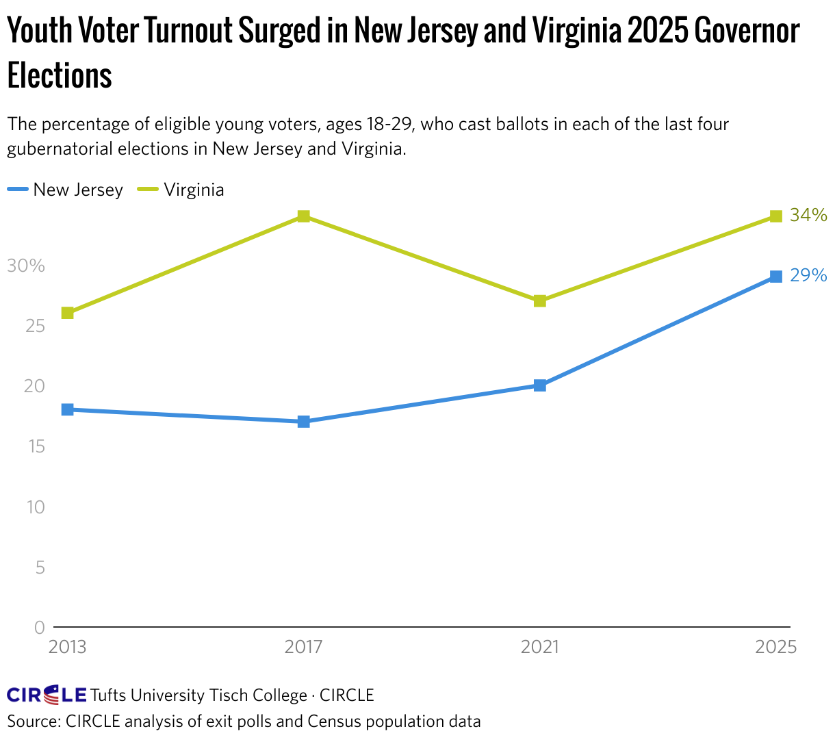 The percentage of eligible young voters, ages 18-29, who cast ballots in each of the last four gubernatorial elections in New Jersey and Virginia.