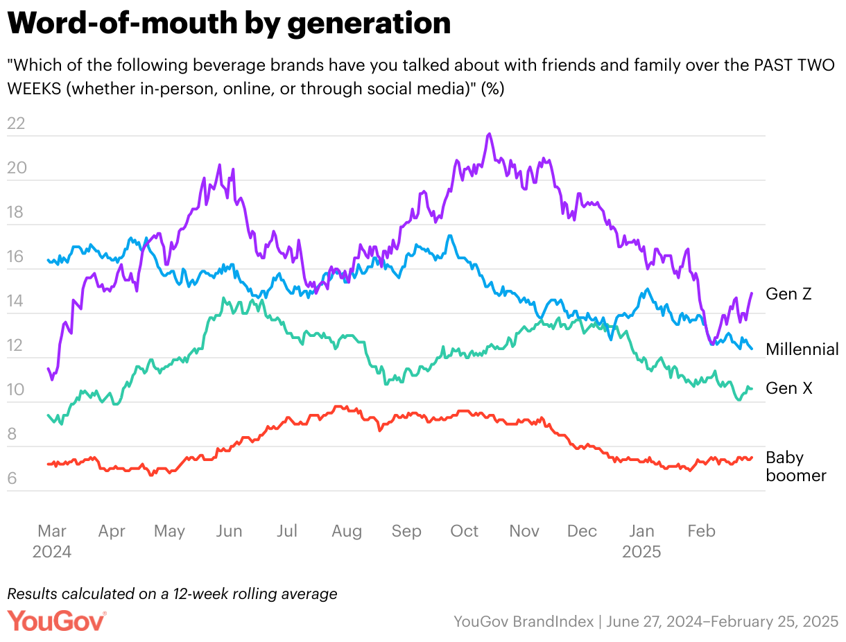 "Which of the following beverage brands have you talked about with friends and family over the PAST TWO WEEKS (whether in-person, online, or through social media)" (%)