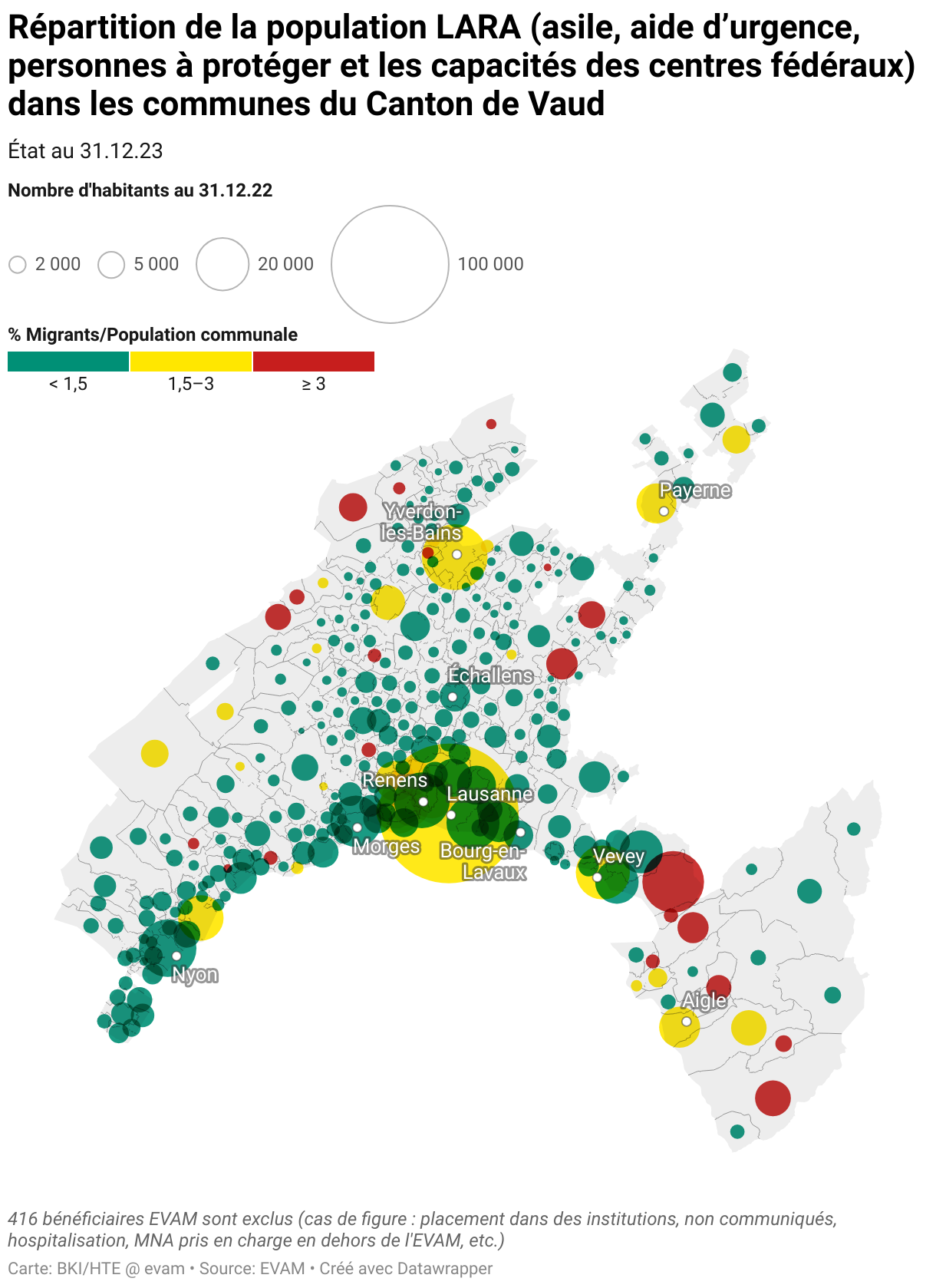 Répartition de la population LARA (asile, aide d’urgence, personnes à protéger et les capacités des centres fédéraux) dans les communes du Canton de Vaud