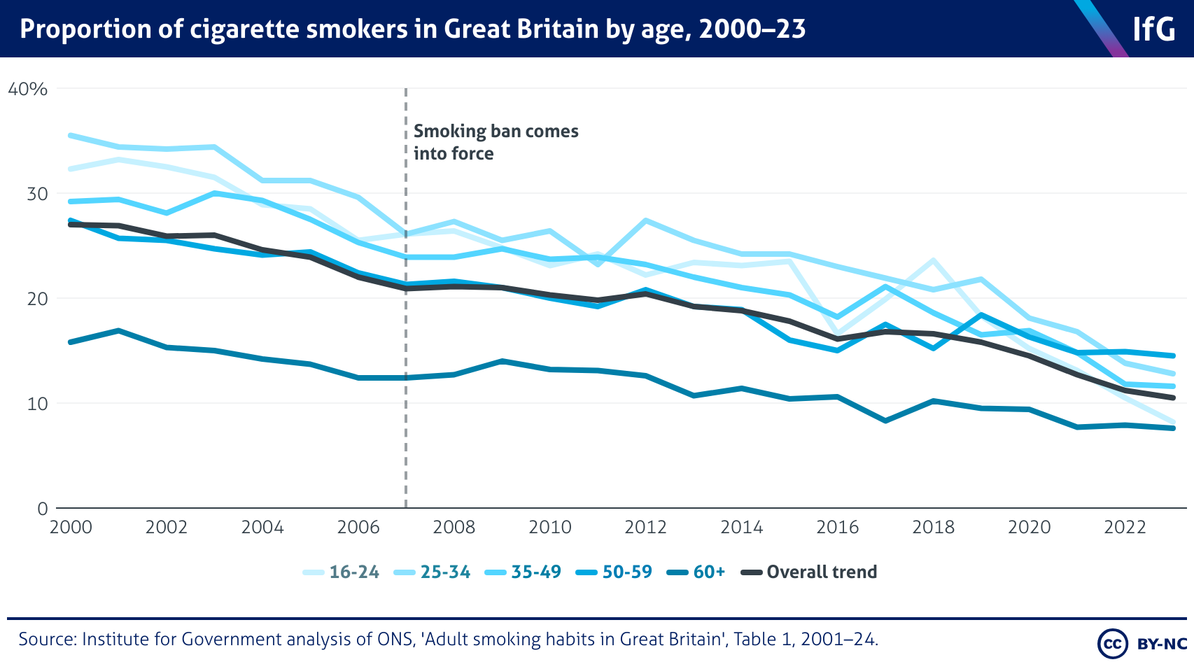 An Institute for Government line chart showing the proportion of cigarette smokers in Great Britain by age, 2000-23, where the proportion of smokers has been in decline across the entire period, reaching 10.5% of the total population in 2023, down from 27% in 2000.