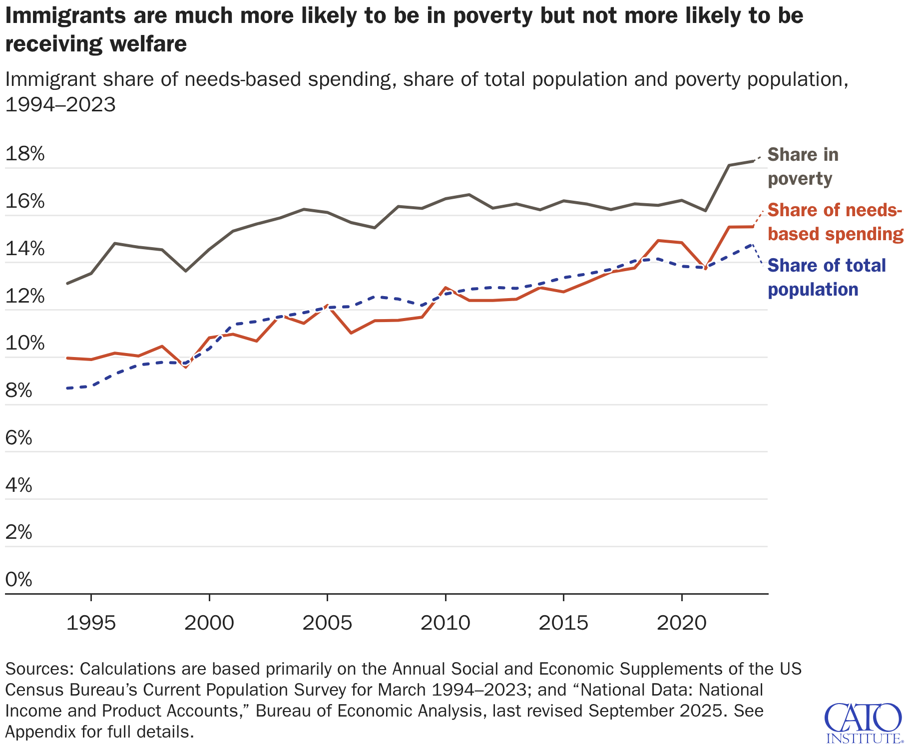 Immigrant share of needs-based spending, share of total population and poverty population, 1994–2023