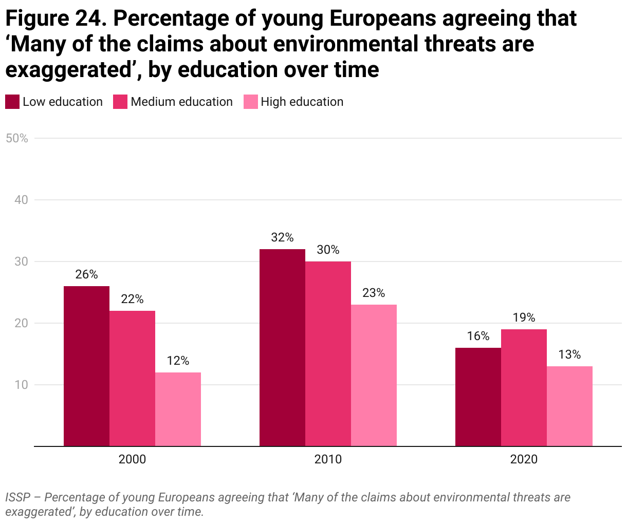 Figure 24: ISSP – Percentage of young Europeans agreeing that ‘Many of the claims about environmental threats are exaggerated’, by education over time.
