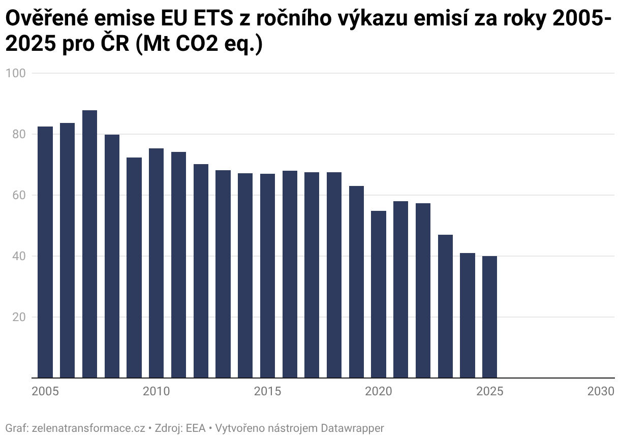 Ověřené emise EU ETS z ročního výkazu emisí za roky 2005-2025 pro ČR (Mt CO2 eq.)