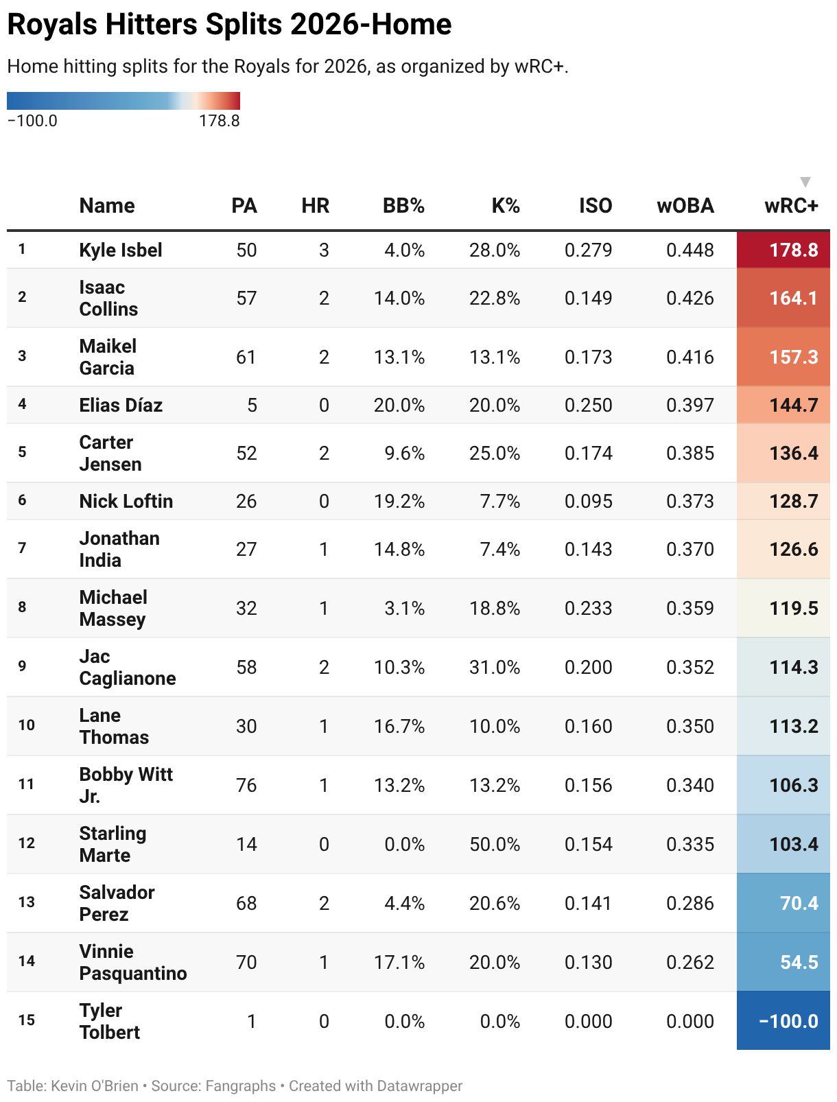 Home hitting splits for the Royals for 2026, as organized by wRC+.
