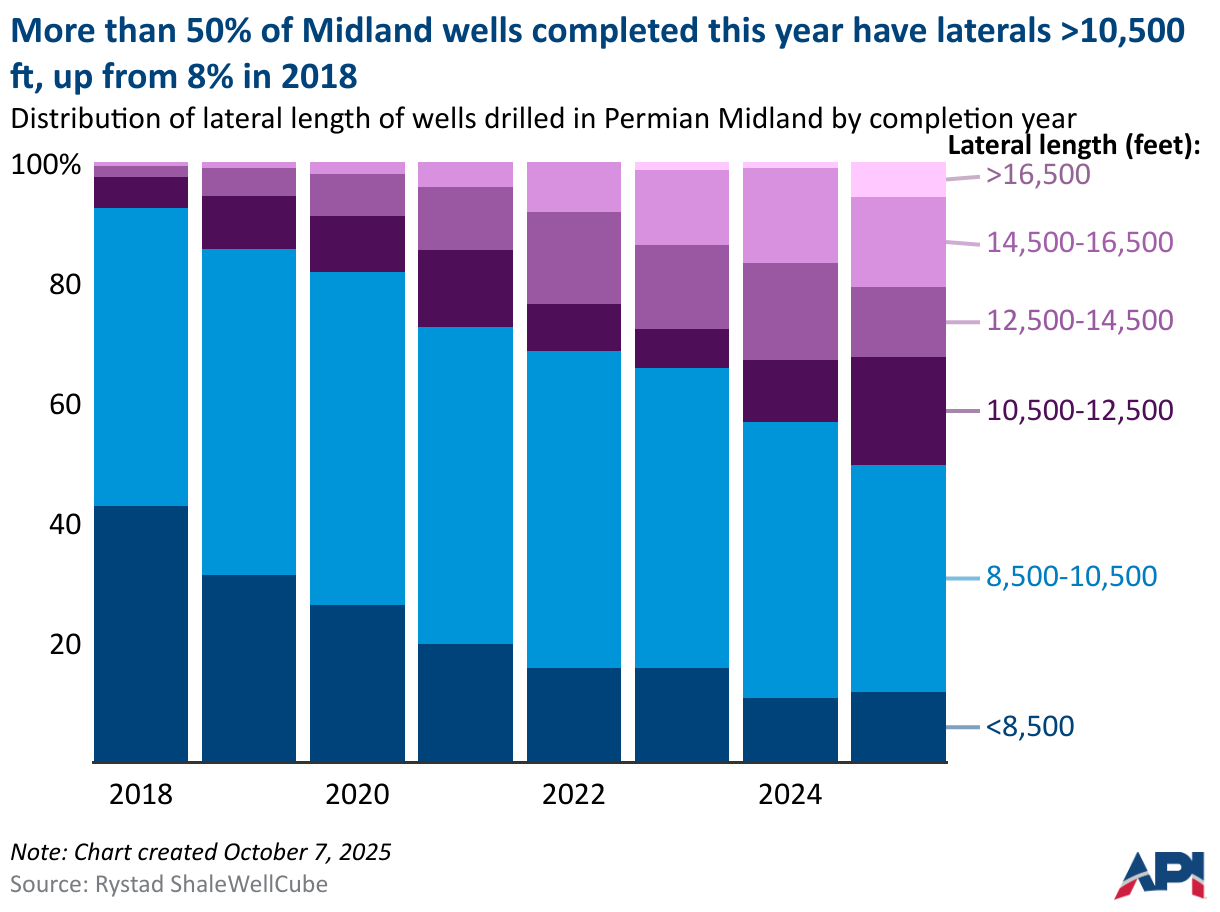 Distribution of lateral length of wells drilled in Permian Midland by completion year