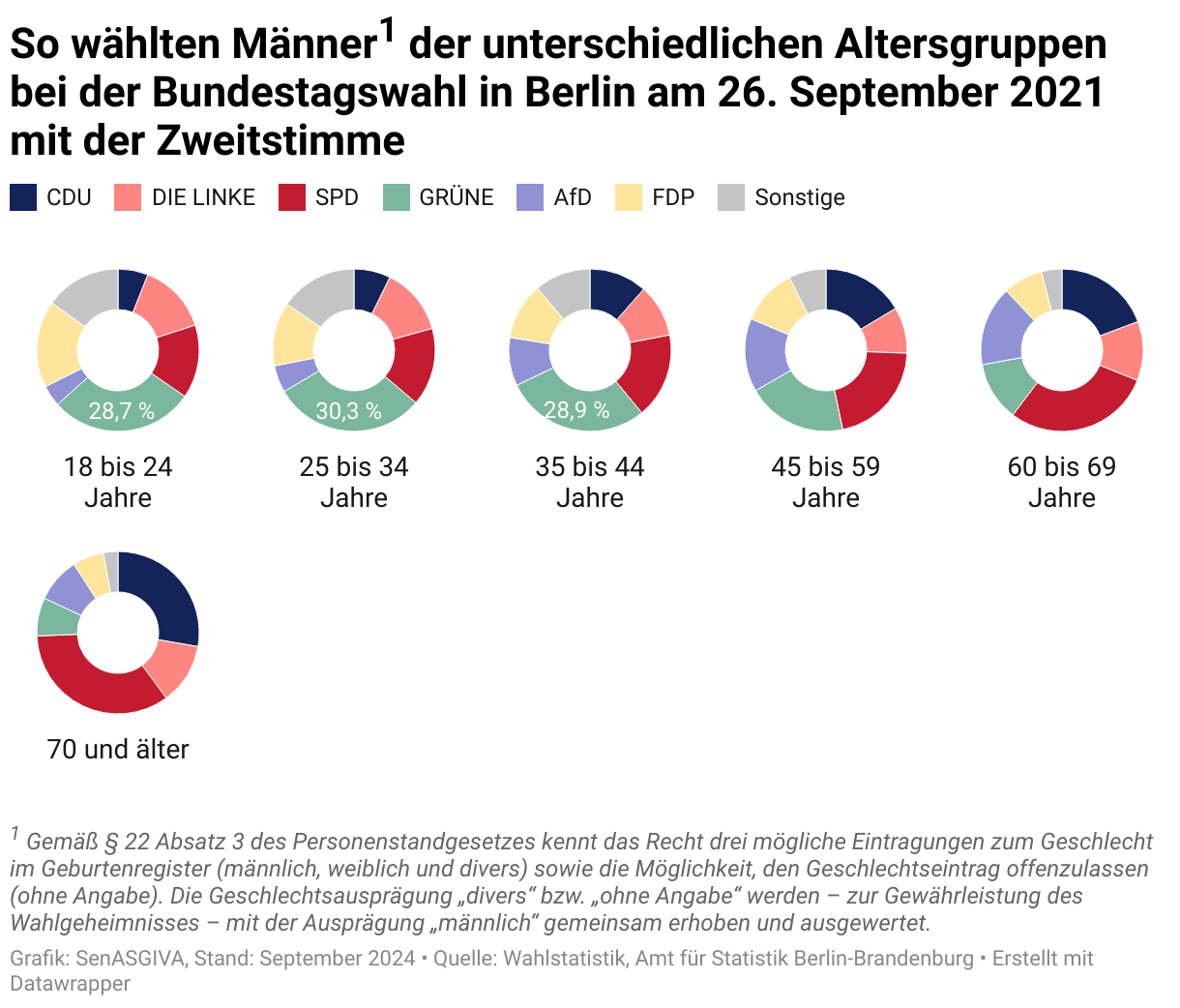 Am stärksten unterschied sich die Wahlentscheidung zwischen der jüngsten und der ältesten Altersgruppe. Die 18- bis 24-jährigen Männer wählten zu einem Drittel die Grünen, dann FDP, aber kaum CDU oder AfD. Linke, SPD und Sonstige lagen nahezu gleich. Die Männer, die 70 Jahre oder älter waren, wählten zu mehr als einem Drittel SPD, gefolgt von CDU und Linke. Grüne, AfD, FDP und Sonstige liegen zwischen 5 Prozent und 10 Prozent.