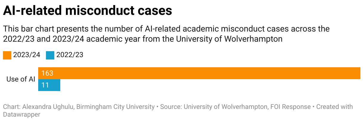 This bar chart presents the number of AI-related academic misconduct cases across the 2022/23 and 2023/24 academic year from the University of Wolverhampton