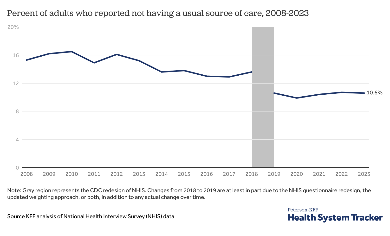 Percent of adults who reported not having a usual source of care, 2008-2023
