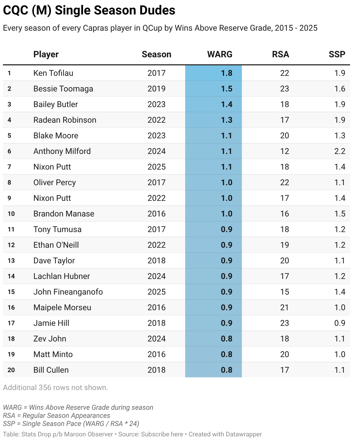 Every season of every Capras player in QCup by Wins Above Reserve Grade, 2015 - 2025