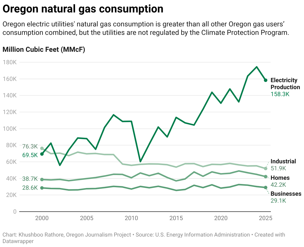 Oregon electric utilities' natural gas consumption is greater than all other Oregon gas users’ consumption combined, but the utilities are not regulated by the Climate Protection Program. Million Cubic Feet (MMcF)