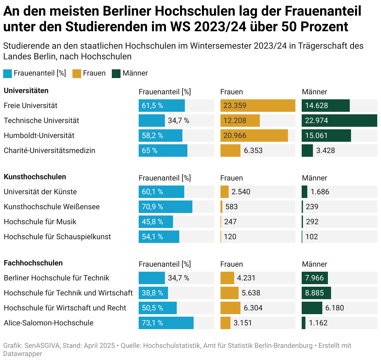 An den Kunsthochschulen studieren insgesamt nur etwa 5.800 Menschen. An der Kunsthochschule Weißensee ist der Frauenanteil mit 70,9 Prozent am höchsten, an der Hochschule für Musik mit 45,8 Prozent am niedrigsten.