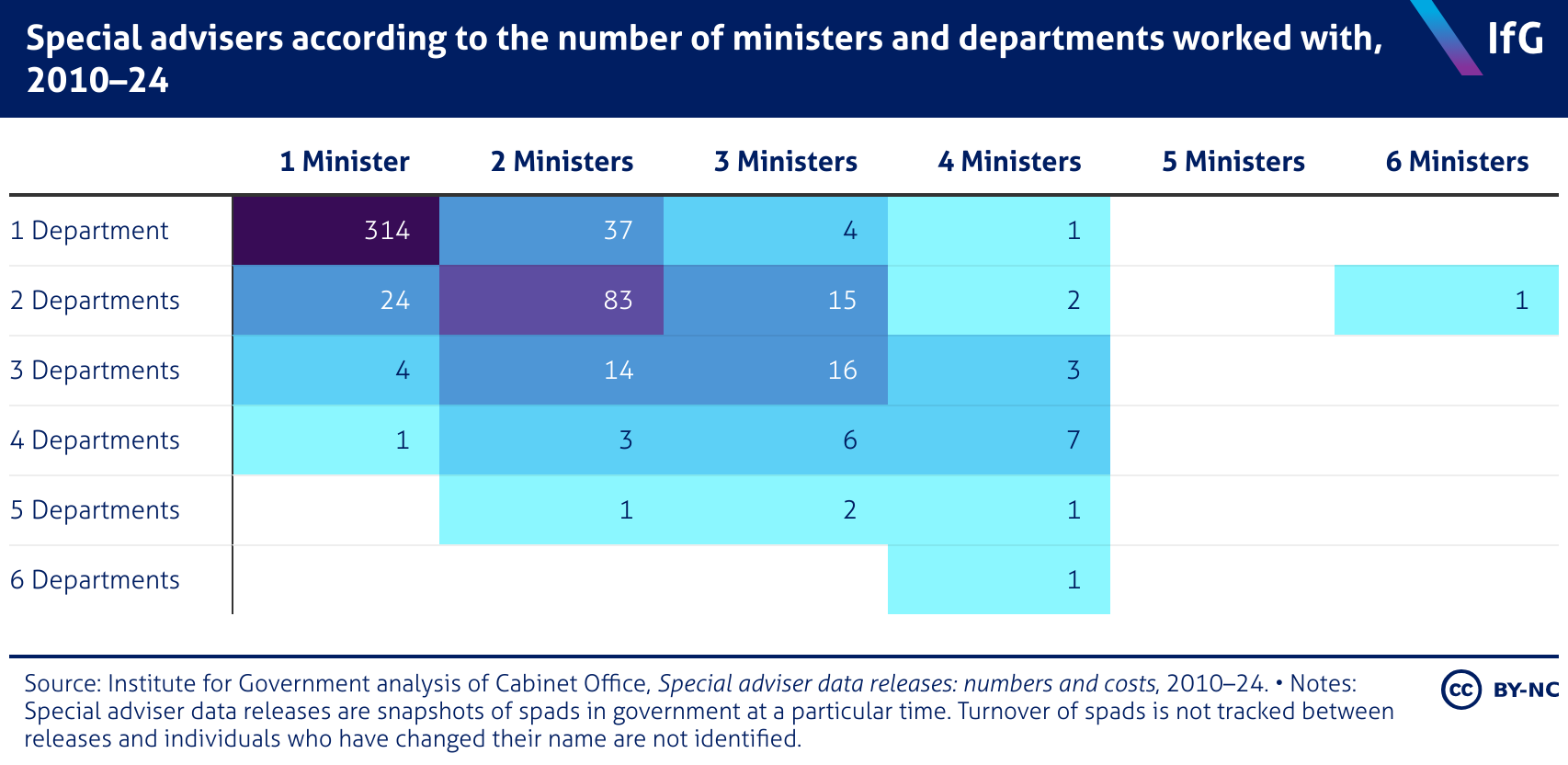 Special advisers according to the number of ministers and departments worked with, 2010–24