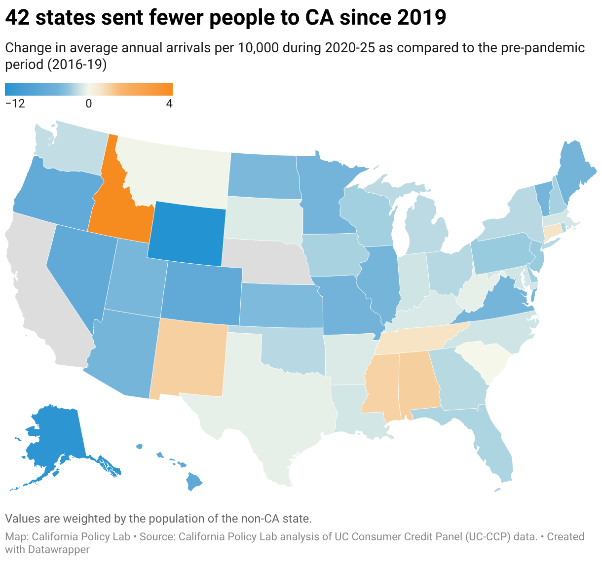 A choropleth map showing the change in annual arrivals per 10,000 residents to California during 2020-2025 compared to the pre-pandemic period. Most of the map is shaded blue, indicating that 42 states sent fewer people to California after 2019. Idaho is a notable exception, shaded orange, indicating an increase in people moving to California from that state.