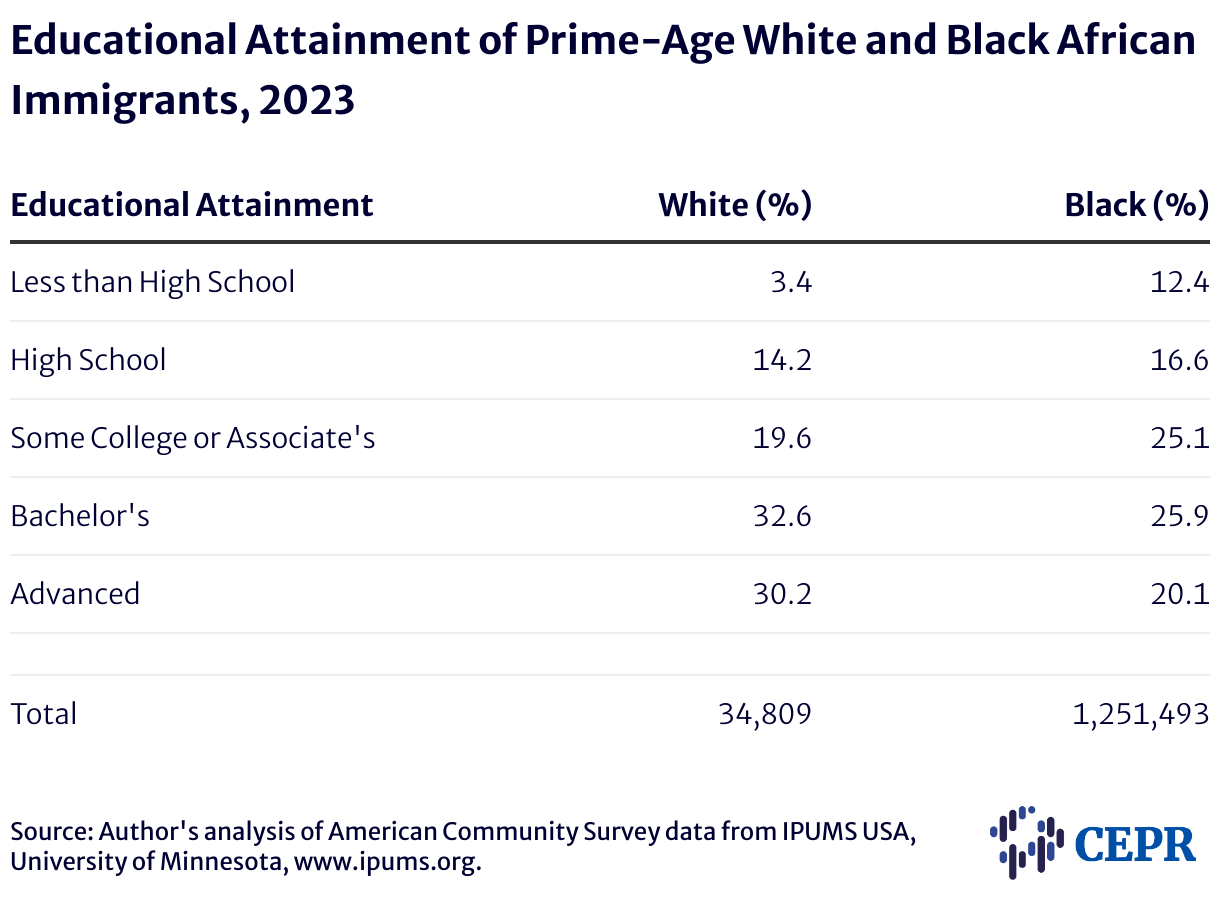 Educational Attainment of Prime-Age White and Black African Immigrants, 2023