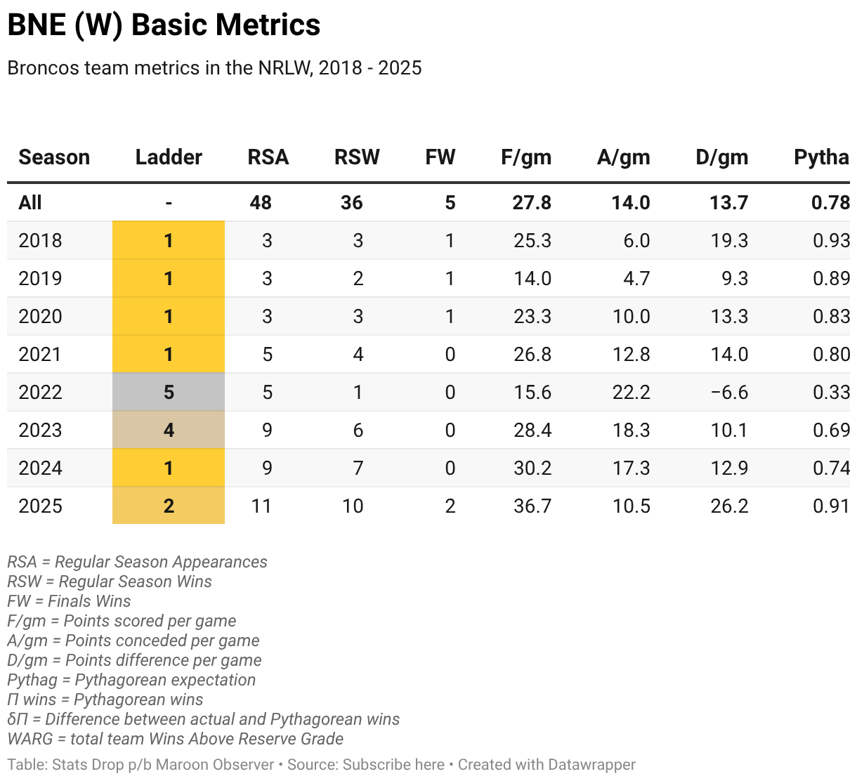 Broncos team metrics in the NRLW, 2018 - 2025