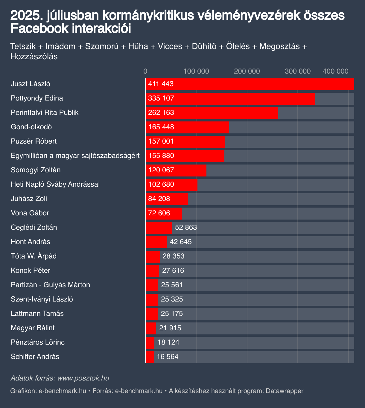 2025. júliusban kormánykritikus véleményvezérek összes Facebook interakciói