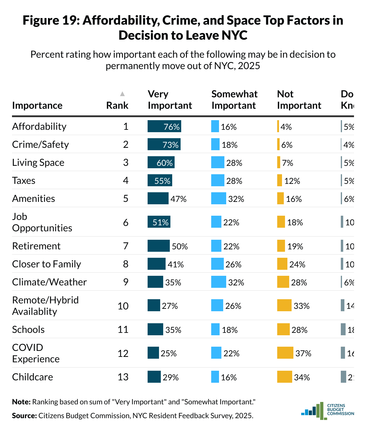 Percent rating how important each of the following may be in decision to permanently move out of NYC, 2025