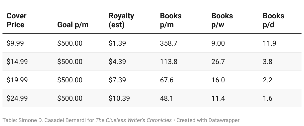 This table shows the number of books to be sold via Amazon KDP to reach a monthly revenue of $500, based on the book's cover price