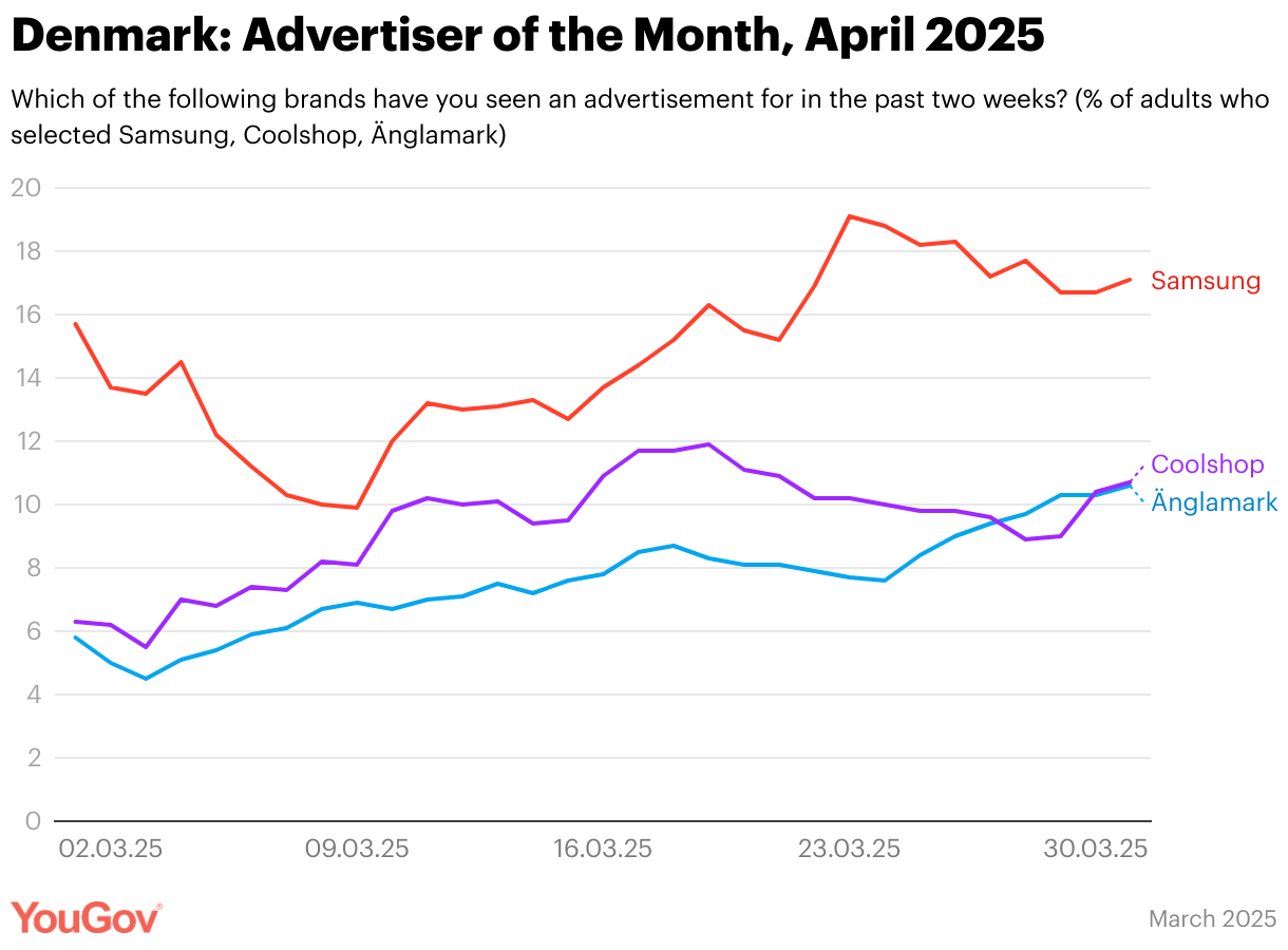 Which of the following brands have you seen an advertisement for in the past two weeks? (% of adults who selected Samsung, Coolshop, Änglamark)