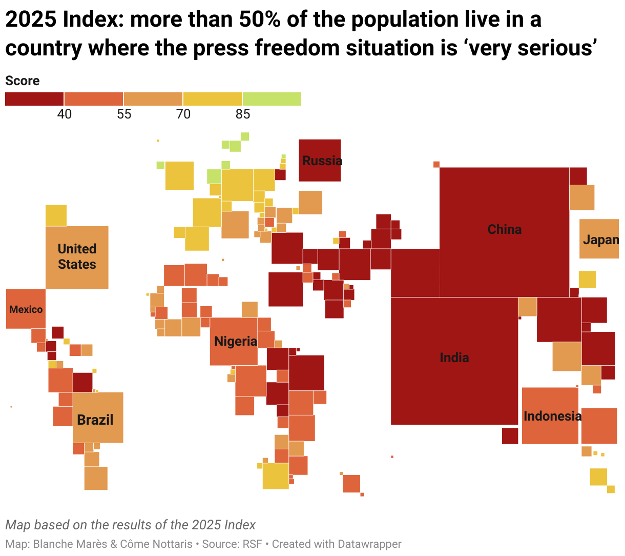 2025 Index: more than 50% of the population live in a country where the press freedom situation is ‘very serious’