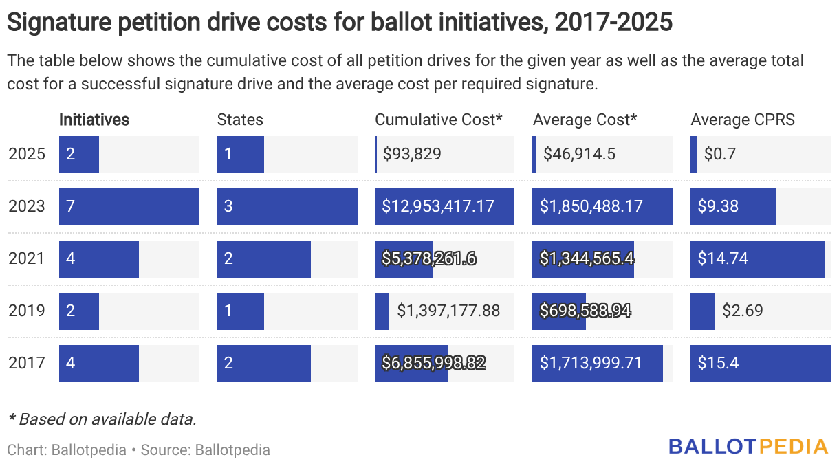 Signature petition drive costs for ballot initiatives, 2017-2025