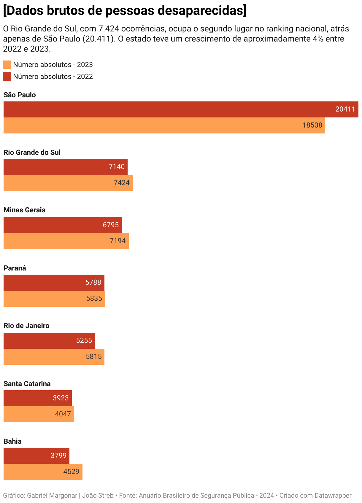 O Rio Grande do Sul, com 7.424 ocorrências, ocupa o segundo lugar no ranking nacional, atrás apenas de São Paulo (20.411). O estado teve um crescimento de aproximadamente 4% entre 2022 e 2023.