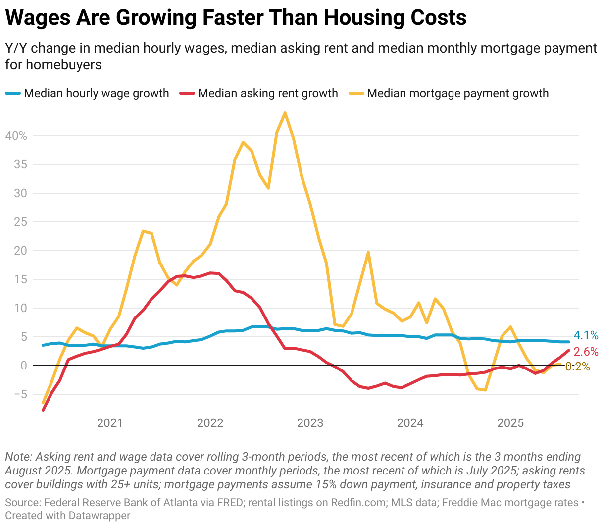 Y/Y change in median hourly wages, median asking rent and median monthly mortgage payment for homebuyers