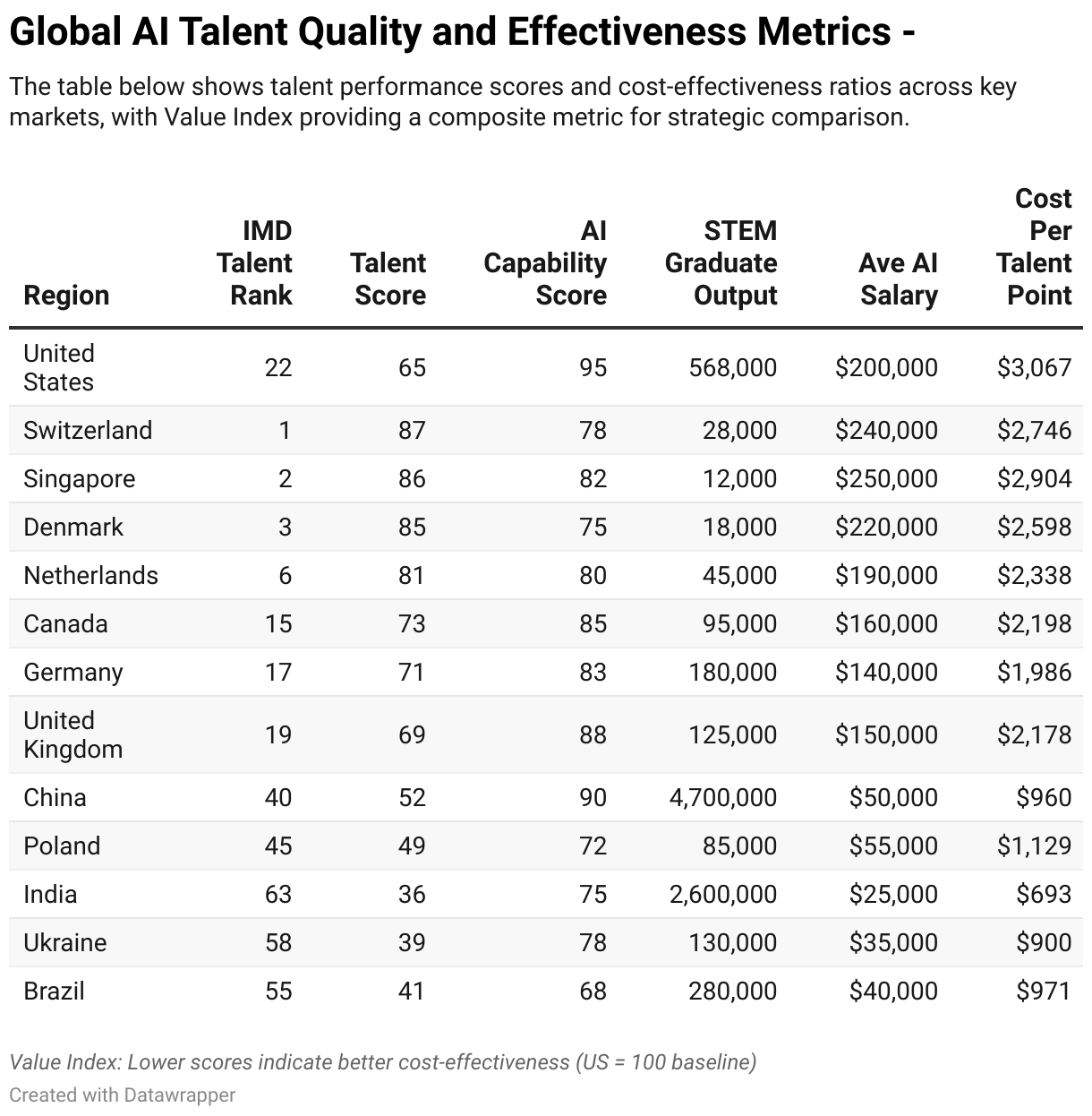 The table below shows talent performance scores and cost-effectiveness ratios across key markets, with Value Index providing a composite metric for strategic comparison.