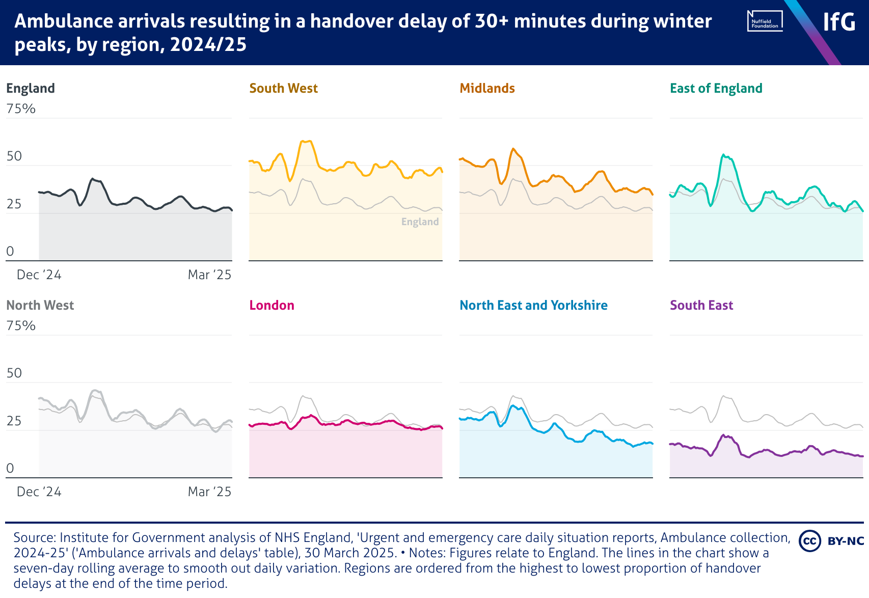 A small multiples chart from the Institute for Government showing Ambulance arrivals resulting in a handover delay of 30+ minutes during winter peaks, by region, 2024/25. Delays varied substantially across regions. The South West and Midlands had the highest proportions, with around 40–50% of arrivals delayed across most of the time period, far above the England average. On the other hand, London and the South East recorded the lowest levels, mostly under 30%.