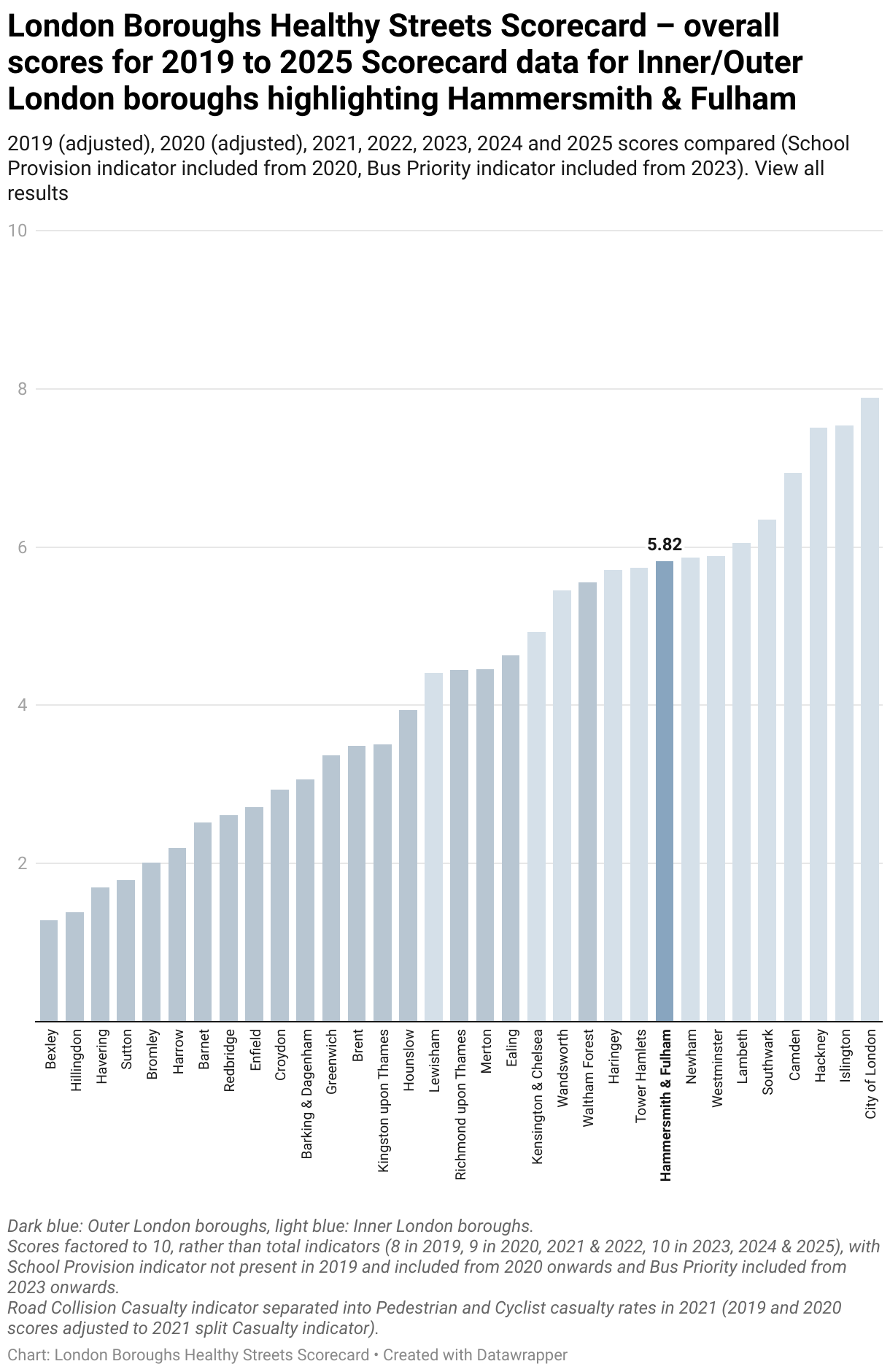 London Boroughs Healthy Streets Scorecard – overall scores for 2019 to 2025 Scorecard data for Inner/Outer London boroughs highlighting Hammersmith & Fulham