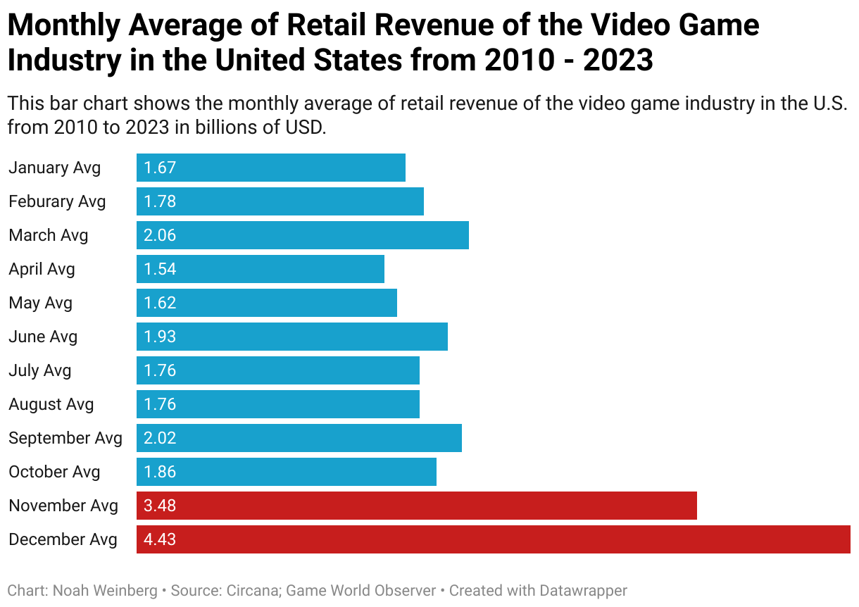 This bar chart shows the monthly average of retail revenue of the video game industry in the U.S. from 2010 to 2023 in billions of USD.