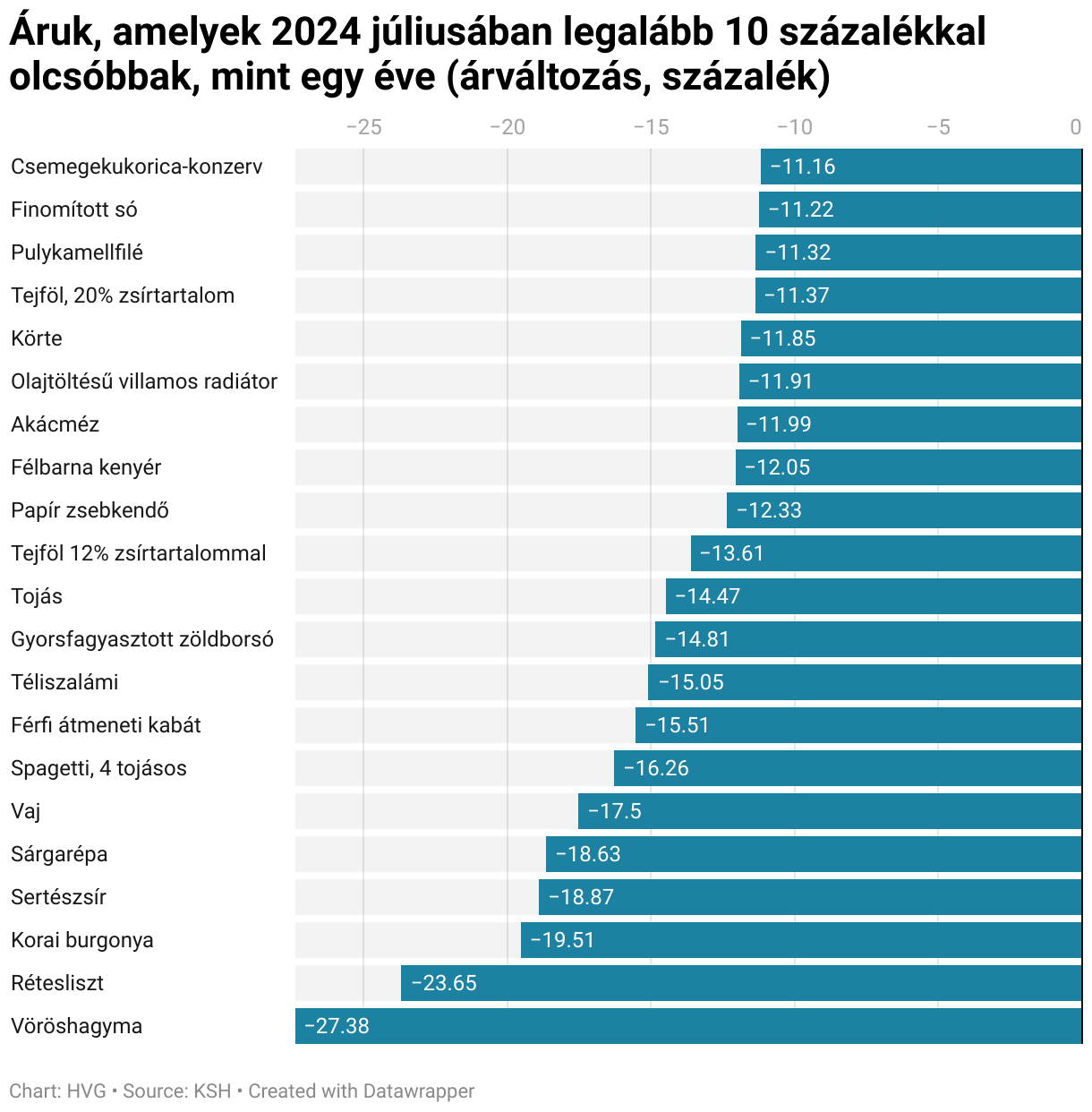 Áruk, amelyek 2024 júliusában legalább 10 százalékkal olcsóbbak, mint egy éve (árváltozás, százalék)