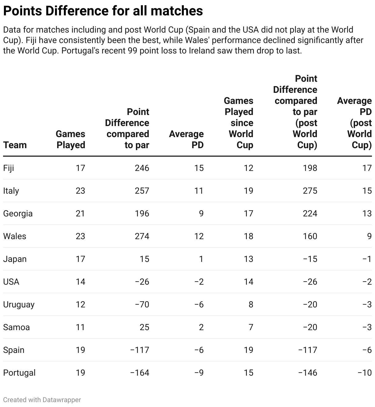 Data for matches including and post World Cup (Spain and the USA did not play at the World Cup). Fiji have consistently been the best, while Wales' performance declined significantly after the World Cup. Portugal's recent 99 point loss to Ireland saw them drop to last.