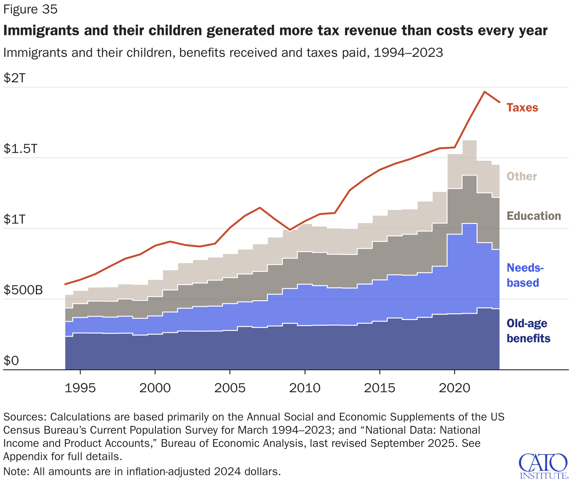 Immigrants and their children, benefits received and taxes paid with interest saved on the national debt, 1994–2023