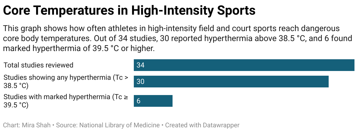 This graph shows how often athletes in high-intensity field and court sports reach dangerous core body temperatures. Out of 34 studies, 30 reported hyperthermia above 38.5 °C, and 6 found marked hyperthermia of 39.5 °C or higher.