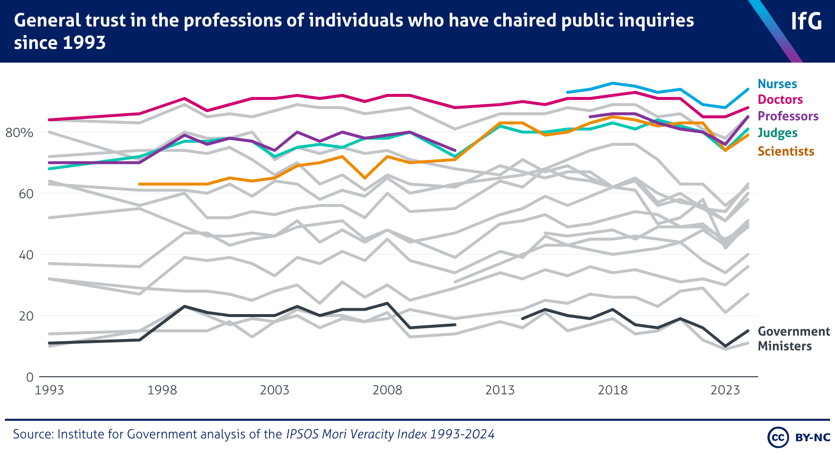 A line chart from the Institute for Government of general trust in the professionals of individuals who have chaired public inquiries since 1993 where nurses score highest, followed by doctors, professors, judges then scientists. All have a significantly higher score than government ministers.